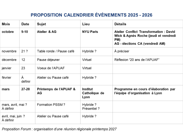APUAF will do its best to maintain all dates without modification or cancellation but may need to shift topics and content of different events depending on the availability of those organizing and animating the events. We will announce precise times, themes, topics or agenda once they are confirmed for each event. Sign-up will be announced through the Google Group.